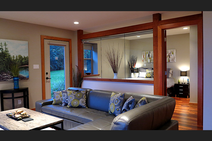 Spacious contemporary 1 bedroom suite with a king size memory foam bed, full kitchen with quartz/granite countertops, stainless steel appliances, living area with wood stove and breathtaking ocean and mountain views. (interior colors may vary)